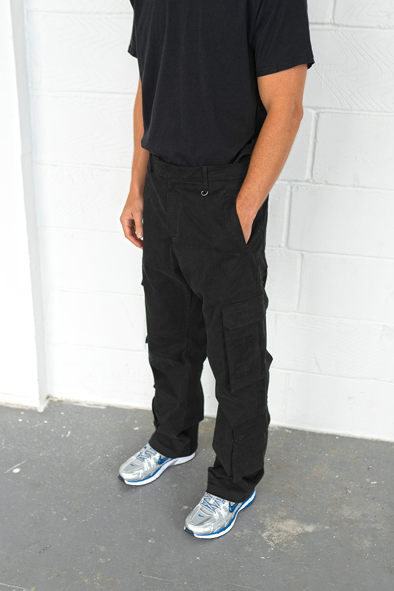 Introducing The Baggy Cargo in black, a new Marvotti silhouette. A baggy fit pant crafted from a luxury soft brushed cotton, featuring 4 3D leg pockets and 2 back pockets. The cargo pants have a fixed waistband with YKK front fly zipper and are finished with a metal D ring to front belt loop.