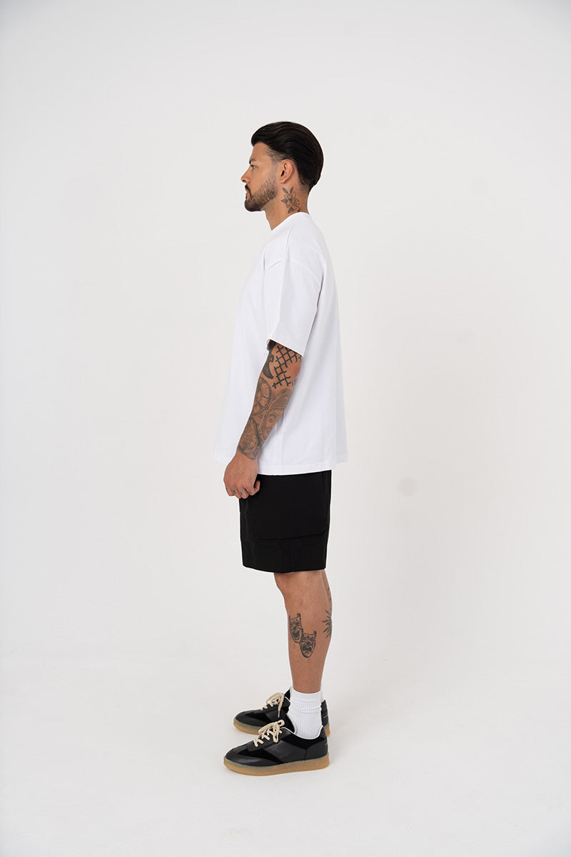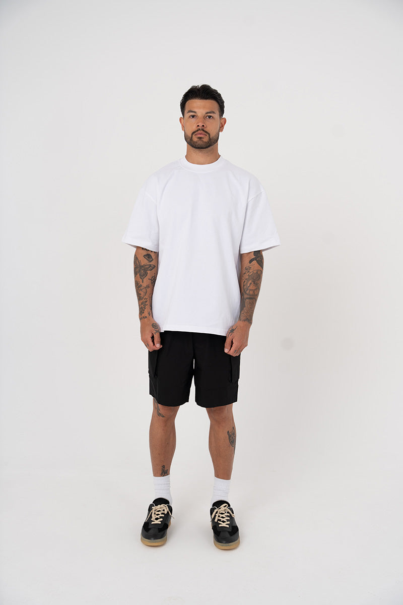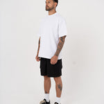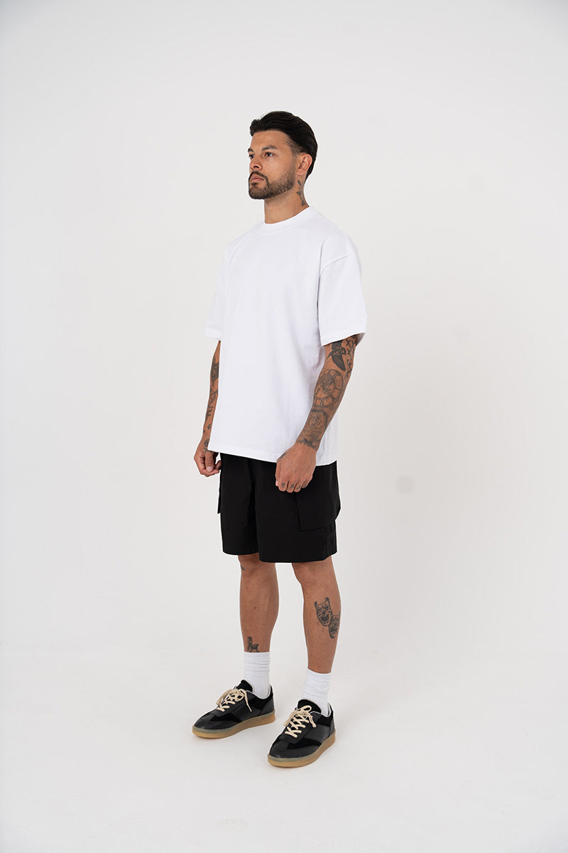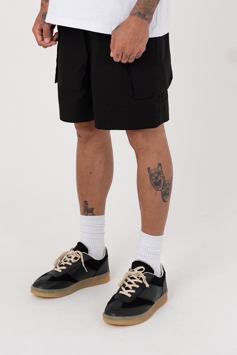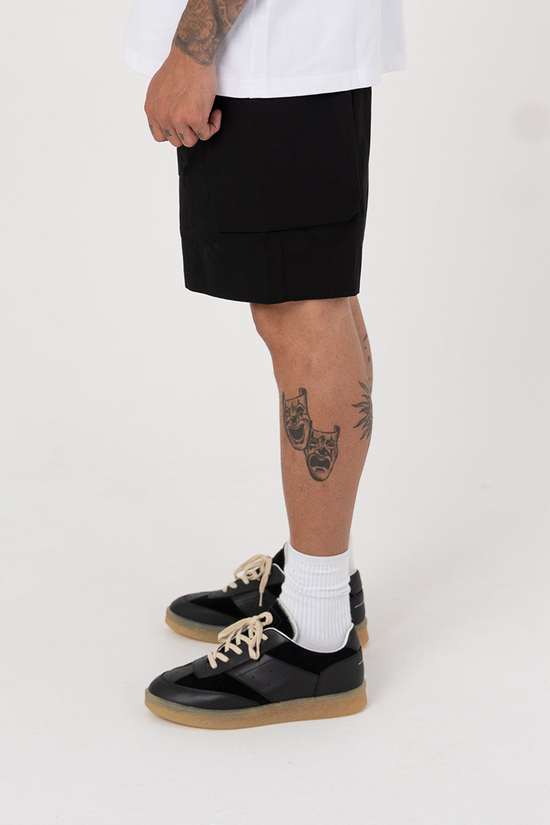 Introducing the cotton Cargo Short in Black, a luxury cargo short style crafted with oversized 3D pockets. They have a boxy fit, with the addition of zipper pockets.